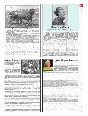 Janet Grayson Whitehouse Janet Grayson Whitehouse, a long-time resident of the Middleburg area, who for 50 years was at the forefront of the conservation and historic preservation movements, died peacefully at home on Christmas Eve at the age of 87 after suffering from a long illness. Mrs. Whitehouse had a strong Christian faith which informed her lifelong devotion to serving others and being a steward of natural and historic resources. “She was dearly beloved to all of us and was the energy and spirit behind so much of the good that has happened in the Piedmont,” said Chris Miller, president of the Piedmont Environmental Council. “She was a woman of great kindness, dignity and grace who knew what was right. She never wavered in pursuing what was right, encouraging the rest of us to rise to her level of courage and commitment.” A master at involving others and energizing efforts on behalf of charitable organizations, she once described her approach as “advocacy is a team sport.” In 1993, in coordination with the PEC and as co-chairman of the Goose Creek Association, she spearheaded the first meeting--held at Grace Episcopal Church in The Plains--to rally opposition to Disney’s proposed theme park near Haymarket. “The meeting was organized to feel the pulse of opposition within our community,” Childs Burden, president of the Mosby Heritage Area Association has said. “Well, the pulse was not beating it was racing.” This was the opening salvo in the battle which ultimately led to Disney’s abandonment of the project. In 1995, she co-founded and chaired the Mosby Heritage Area Association, which through its “preservation through education” programs annually teaches over 5,000 Virginia students about local history. Through its many initiatives, MHAA serves as an advocate for the preservation of historic, cultural, scenic and natural resources of the Northern Virginia Piedmont. Its many educational programs seek to bring an awareness of the significant heritage of this unique area which in turn leads to an appreciation for its preservation. Her work in the field of conservation began in the 1960s working on behalf of the Audubon Naturalist Society, where her first husband, William Grayson, served as president. During this time, Mrs. Whitehouse helped to found “Concern,”’ a women’s environmental organization. She also co-authored the “Living Garden Calendar” in 1970 which gave practical advice about growing plants without the use of chemicals. The calendar was a huge success and was reprinted for many years. Her love of horticulture was reflected in her long commitment to the FauquierLoudoun Garden Club (1960-2013) and her work there as Conservation Chair. Her love of history was manifested in a 16-year tenure as a director of Stratford Hall-- the Lee Family ancestral home--where she was vice president and a member of the executive committee. She also dedicated significant efforts on behalf of Oatlands of the National Trust for Historic Preservation, the Garden Club of America, the National Gallery of Art and Trinity Episcopal Church in Upperville. She worked for two years at the World Wildlife Fund as a projects administrator and development officer in the early 1980s. Mrs. Whitehouse was born June 5, 1926, in Pittsburgh, the daughter of George and Thelma Patton Ketchum. She was a 1943 graduate of Chatham Hall and earned a Bachelors degree from Vassar College in 1946. In 1949 she joined the State Department’s Office of Intelligence Research as a political analyst for Belgium and Luxembourg. In April, 1951 she married William Cabell Grayson, program director for NBC, Washington, and later special coordinator for telecommunications for the Smithsonian Institution and president and chairman of the Audubon Naturalist Society. He died in April, 1980. Together they worked on preserving the C&O Canal, and in opposition to Potomac River dams and the Salem Church dam. They also helped spearhead funding for studies leading to the Virginia Scenic Rivers Act, the founding of the Conservation Council of Virginia, and support of the Virginia Outdoors Plan. They also wrote “Raising Wood Ducks in Captivity” and gave the National Zoo its first wood ducks. In October, 1984 she married Charles S. Whitehouse, a Yale classmate and friend of her first husband, who served as ambassador to Laos and Thailand in the 1970s. He was the first Assistant Secretary of Defense for Special Operations and Low Intensity Conflict in the Reagan administration, and later was chairman of the Piedmont Environmental Council when it opposed Disney’s planned theme park development. He died in June, 2001. Mrs. Whitehouse often said that she had “the two happiest marriages one could ever have.” She shared both of her husbands’ devotion to conservation, and her care of them during illnesses was inspirational. Mrs. Whitehouse is survived by three children, William Cabell Grayson, Jr. (Susan) of Upperville; Katherine Grayson Wilkins (Fraser Bryan) of Washington, D.C. and George Grayson of Upperville; three stepchildren, Sheldon Whitehouse (Sandra) of Newport, RI; Charles R. Whitehouse of Malibu, CA and Sarah Whitehouse Atkins of Newport, RI; five grandchildren, Paul Cabell Grayson, William Cabell Grayson, III, William Fraser Wilkins, Torrey Grayson Wilkins and Emily Payne Wilkins and five step grandchildren, Virginia Atkins, Helen Atkins, Charles Atkins. Mary (Molly) Whitehouse and Alexander Whitehouse. Memorial contributions can be sent to the Mosby Heritage Area Association (designated to “Janet Grayson Whitehouse Fund”) or the Piedmont Environmental Council.