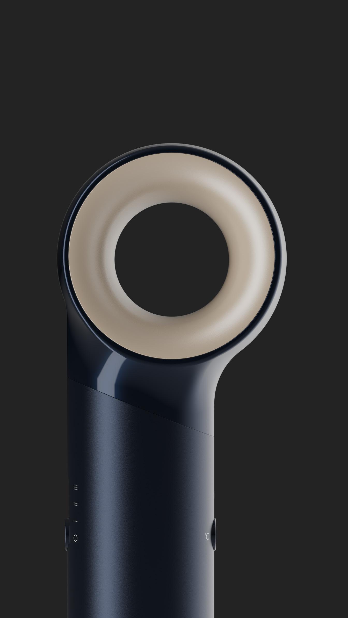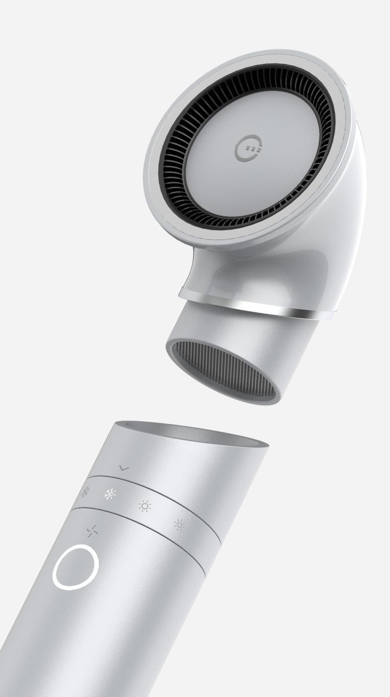 The device is designed with a unique rotating temperature adjustment ring, enabling quick and intuitive temperature changes, and a single button that controls power and fan speed. Both controls feature illuminated indicators: temperature adjustments display in different colors and icons, while fan speed is shown through a radial light ring surrounding the button.