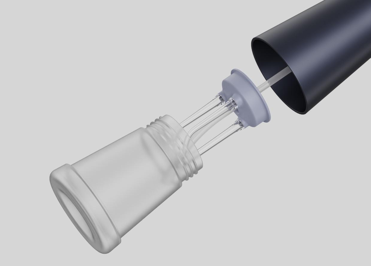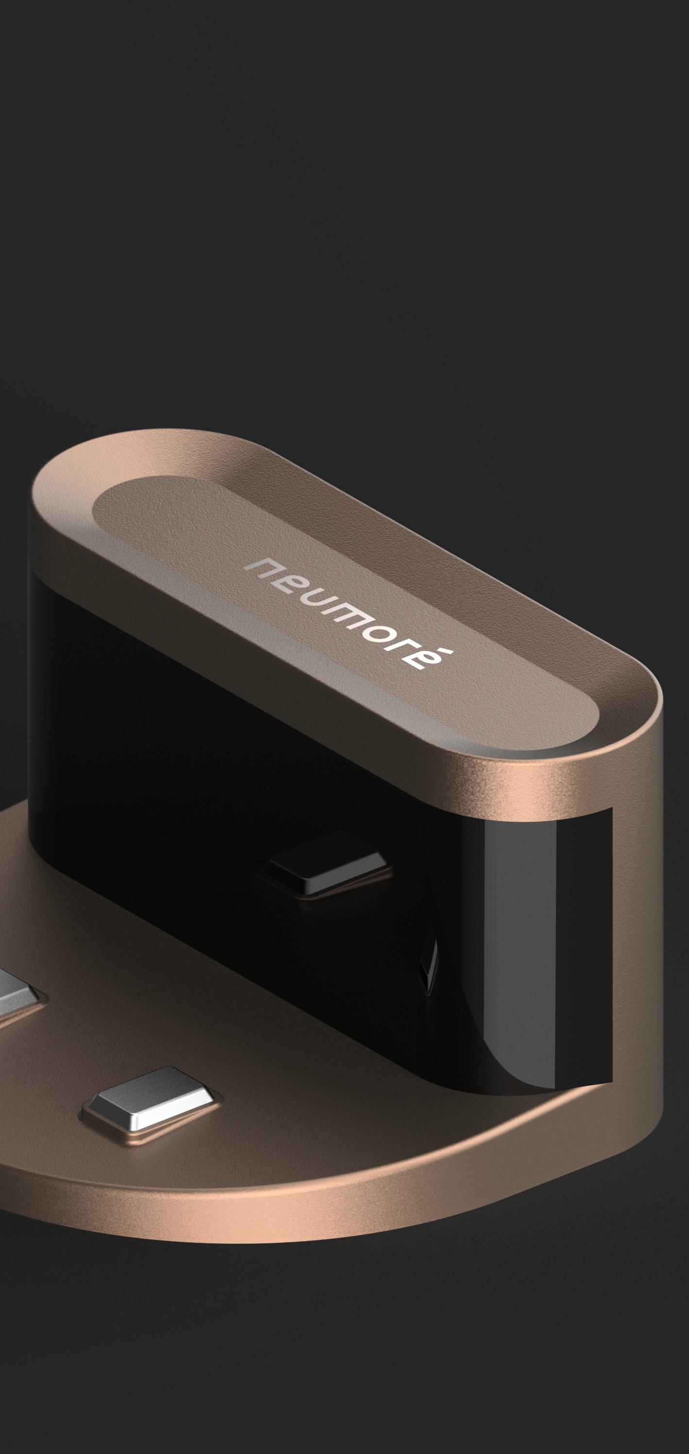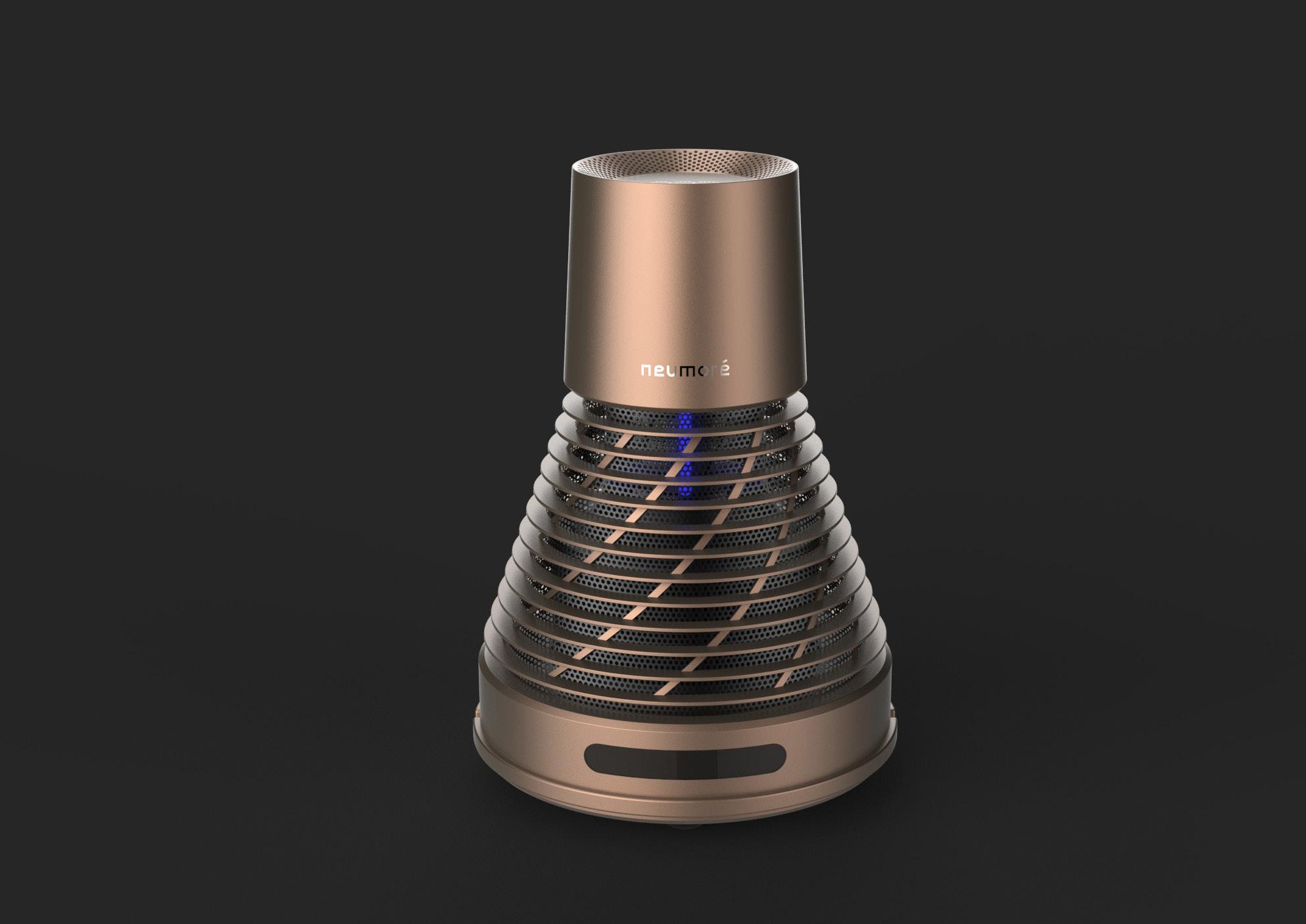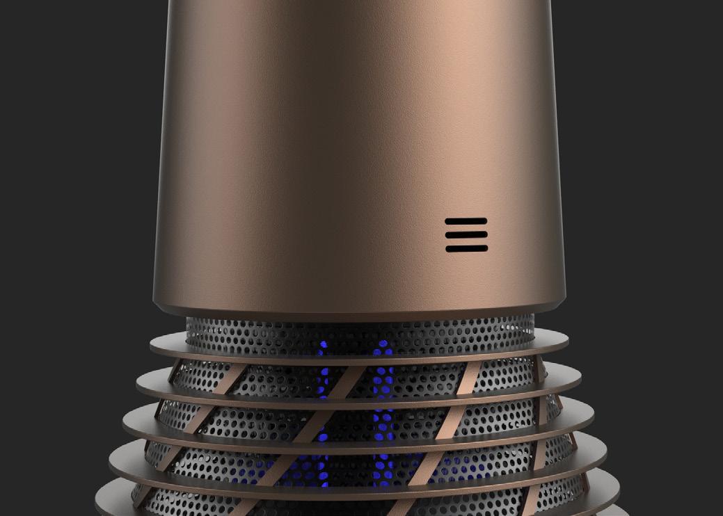 The design takes inspiration from retro aesthetics, incorporating fins and steel mesh for its air intake design. Its cone shape contributes to a visually smaller and distinctive profile. The mesh perforation design enables visibility of the UV light during operation, allowing not only the sterilization of the air entering the device but also some degree of disinfection of the surrounding environment.