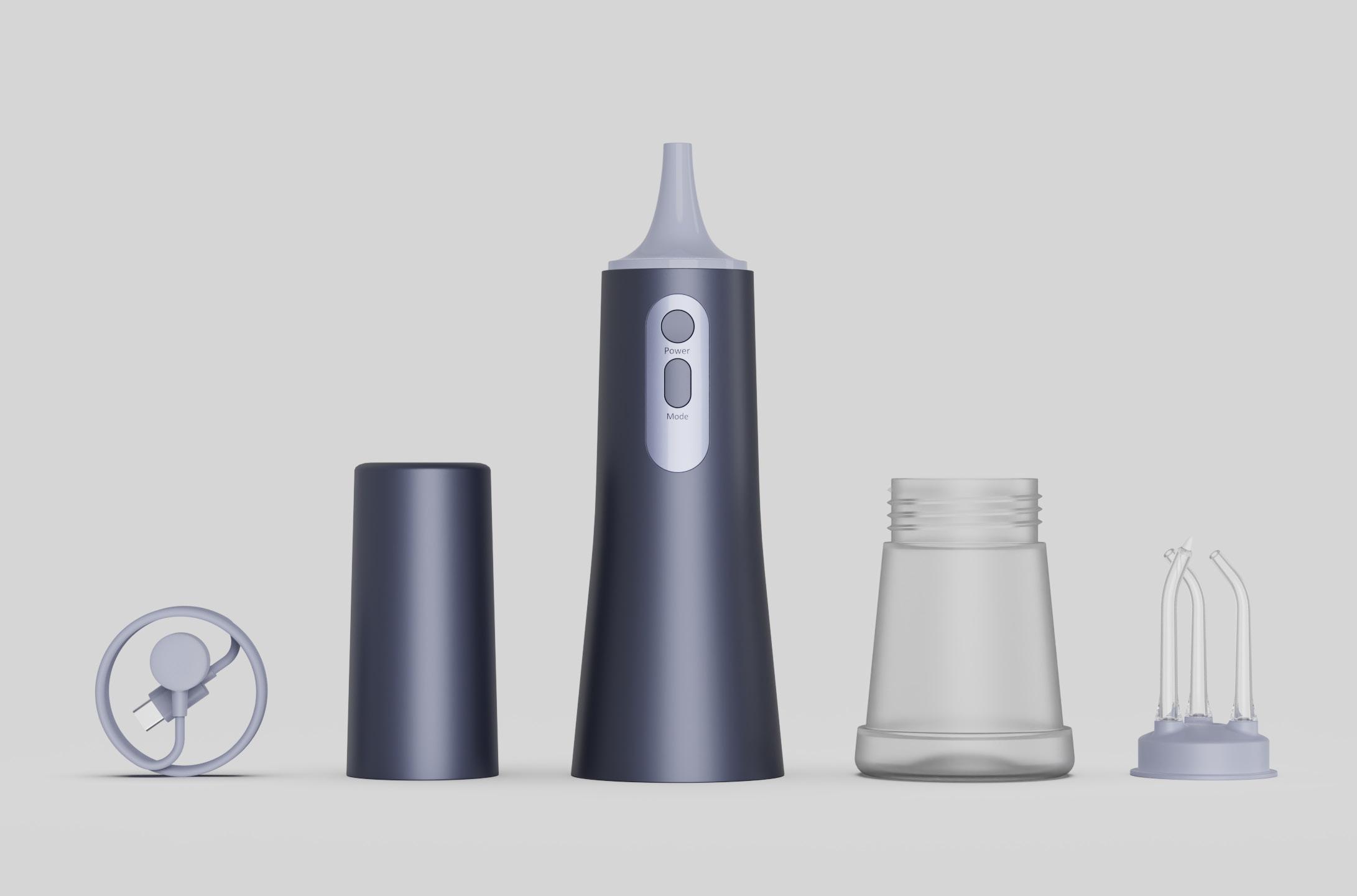 This concept for a portable water flosser presents a refined and contemporary design that sets it apart from existing market offerings. The flosser is designed in an ultra-compact form factor, incorporating a detachable water reservoir that doubles as a storage compartment for three interchangeable nozzles, and a cap meauring at 100ml.