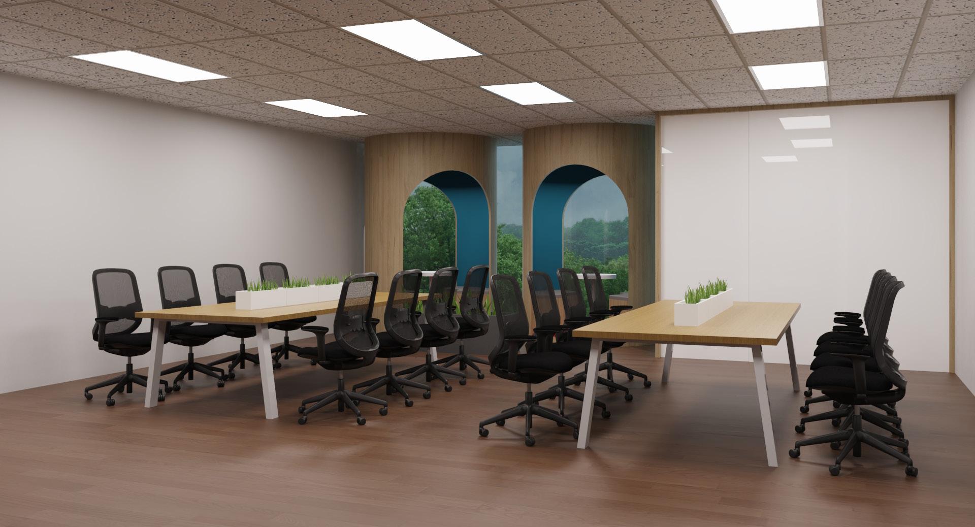 For smaller, more isolated working spaces, the design incorporates fewer modular hot desks, complemented by removable planter boxes that serve as dividers.