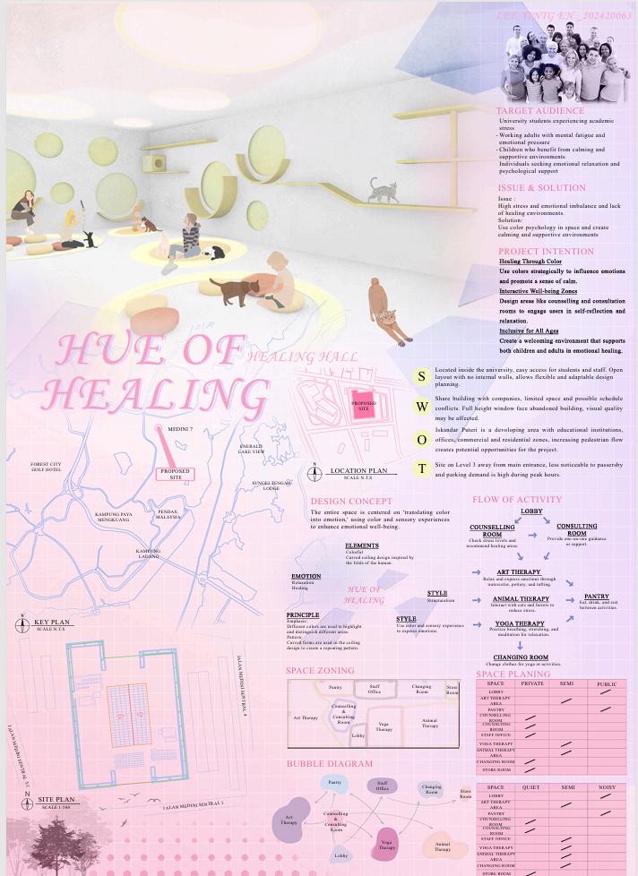 My project focuses on creating a therapeutic environment that explores the relationship between color and emotion, aiming to support emotional well-being and stress relief. The design draws inspiration from emotional transitions, using gradients, vibrant colors, and flowing forms to create a space that feels expressive, immersive, and healing. Through this project, I learned how to translate abstract emotions into spatial experiences, how to enhance atmosphere through color and sensory elements, and how to design spaces that guide users through different stages of emotional release. I also gained experience in concept development, spatial organization, and presenting ideas in a clear andcohesiveway。