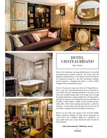 Paris, France Discover the refinement and unparalleled charm of a beautiful nineteenth-century Parisian mansion, 150 meters from the legendary Champs-Elysées, on the quietest street of the district. An exceptional setting for a stay that marvelously combines tourist attractions — shopping and culture — of the Golden Triangle of Paris, and absolute serenity. A haven of peace two steps away from the Champs-Elysées... Like a score, the Chateaubriand Hotel draws its harmony in every detail, from the imposing chandelier in the patio to the velvet and crocodile lounge chairs in the living room, through the powder-pink doors coming straight from a Venetian palace, the bull’s eye window and the black chimney from the Palace of Versailles, a shell sculpture, a flight of stairs, petrified wooden coffee tables, 18th century paintings and portraits, a collection of beetles... In these places, Romain Rio reinvents the story of each object, making it timeless and wildly contemporary! Discover in the nooks and crannies of the hotel the hidden delicate miniature paintings of 18th century inspiration. In a door frame, near a fireplace, hidden by a headboard... So many subtle winks and so many details that make the spirit of Chateaubriand. 6 Rue Chateaubriand, 75008 Paris, France rrhotels.fr 7 6 | L E FA I R MAG AZI NE