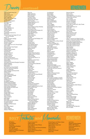 Donors ...continued Molly and Mark Levine, M.D. Sasha Levine Irish Lannette Lewis Richard J. Lewis Susan Lieberman Becca Little and Tom Cooke Lindsey Longerot Sandra Patricia Longoria Flor Estela Lopez Jani Lopez Liliana M. Lopez Norma K. Lord Terry Losiewicz Kathryn Elizabeth Lott Lindsey Joy Love J Patrick Luby III Rita Lucido Lymphedema Institute, Inc. Toni Lynch Mariana Chavez Mac Gregor, M.D. and Mr. Amit Parulekar Macyâs, Inc. Carolyn and Steven Mafrige Don Mafrige, Jr. Joel and Rocky Mafrige Mauney K. Mafrige Patrick J. Magee Linda S. Magill, M.D. and J. Patrick Magill Jane T. Malin March of Dimes, Texas Chapter Dave Marchese Marek Family Foundation Courtney Martin Patrick Martin Johnathan Martinez Micaela Martinez Timothy J. Martinez Veronica Martinez Michele and Rick Martini Marvy Finger Family Foundation Nancy MathĂ© Daniel Maxwell May Jeanne and Garland Slaughter Foundation Brooke McAdams Gayle G. McCloud Stacy McGee Lee McGuire and Colin Mitchell Mary Ann and David McKeithan Carol L. G. McKinney Mark McMasters and Richard Holt Kathryn McNiel David Meany Elaine Mesker-Garcia Collie and Harvey Michaels John J. Middleton Karla Mills Joseph W Milton A.J. Mistretta Ms. Heather Mithcam Mithoff Family Foundation Ginni and Richard Mithoff Melissa and Michael Mithoff Edwin Howard Momberger Tony Montalvo and Greg Purser Wendi Monthy Jessica Moore Katie Moore Nichole Moore Vanessa Taylor Moore Sid Moorhead Matt Moreland Mayra A. Moreno Julia Morgan Bette Moser Scott Moster and Dustin Ruffatto Kim Gerard Mouton Trenisha S. Mouton Katherine and Paul Murphy Jim Mzyk Sarah Oliaee Naghavi Yvonne Nagy William Negrotto Barbara J. Neustaedter