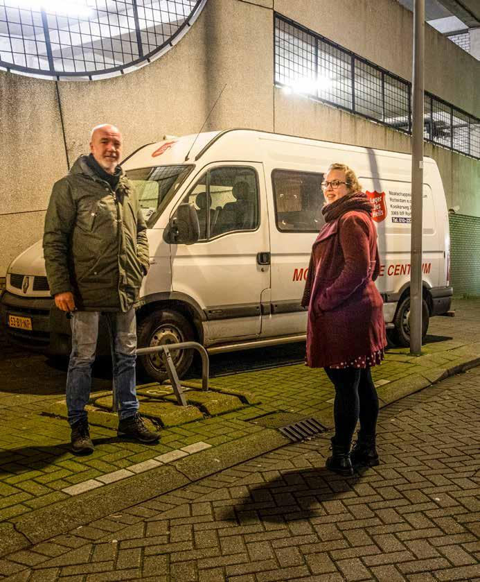 Met een zaklamp schijnt Anne Wietske in de bosjes. Op het Oleanderplein in de Afrikaanderbuurt is een man gesignaleerd die met slaapspullen uit het struikgewas kwam. ‘Dit lijkt me geen goede slaapplek’, zegt Arnold terwijl hij over het plein loopt. De gevoelstemperatuur is beneden het vriespunt, al komt het kwik net niet onder nul. Als het echt vriest, doen de veldwerkers al een avond en nachtronde om mensen van straat te halen. Deze woensdag speuren ze Rotterdam af voor het ochtendkrieken. Net voordat werkend Nederland ontwaakt, is makkelijk te zien wie er geen dak boven zijn hoofd heeft. De veldwerkers weten wat populaire slaapplekken zijn, maar krijgen ook tips van collega’s, wijkagenten, de gemeente of buurtbewoners. Het doel: deze vaak moeilijk begeleidbare mensen naar de nachtopvang bewegen en wie weet uiteindelijk naar hulpverlening. ‘Sinds we samen met andere partijen het project Housing First zijn begonnen, lukt het wel eens om mensen rechtstreeks van de straat aan een woning te helpen. Dan blijven we betrokken en begeleiden we ze de eerste weken nog’, vertelt Arnold. ‘En we helpen bij het aanvragen van een pasje bij de gemeente, waarmee ze de nachtopvang in mogen’, vult Anne Wietske aan.