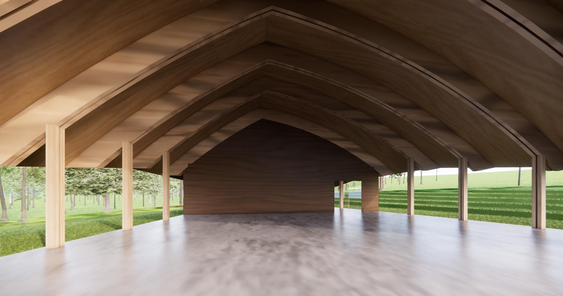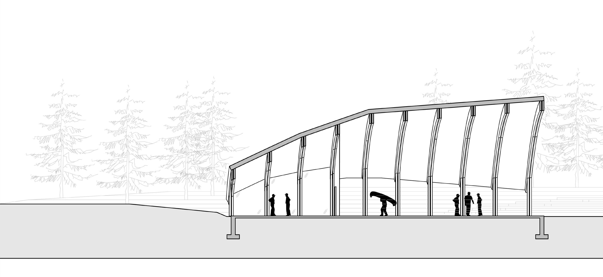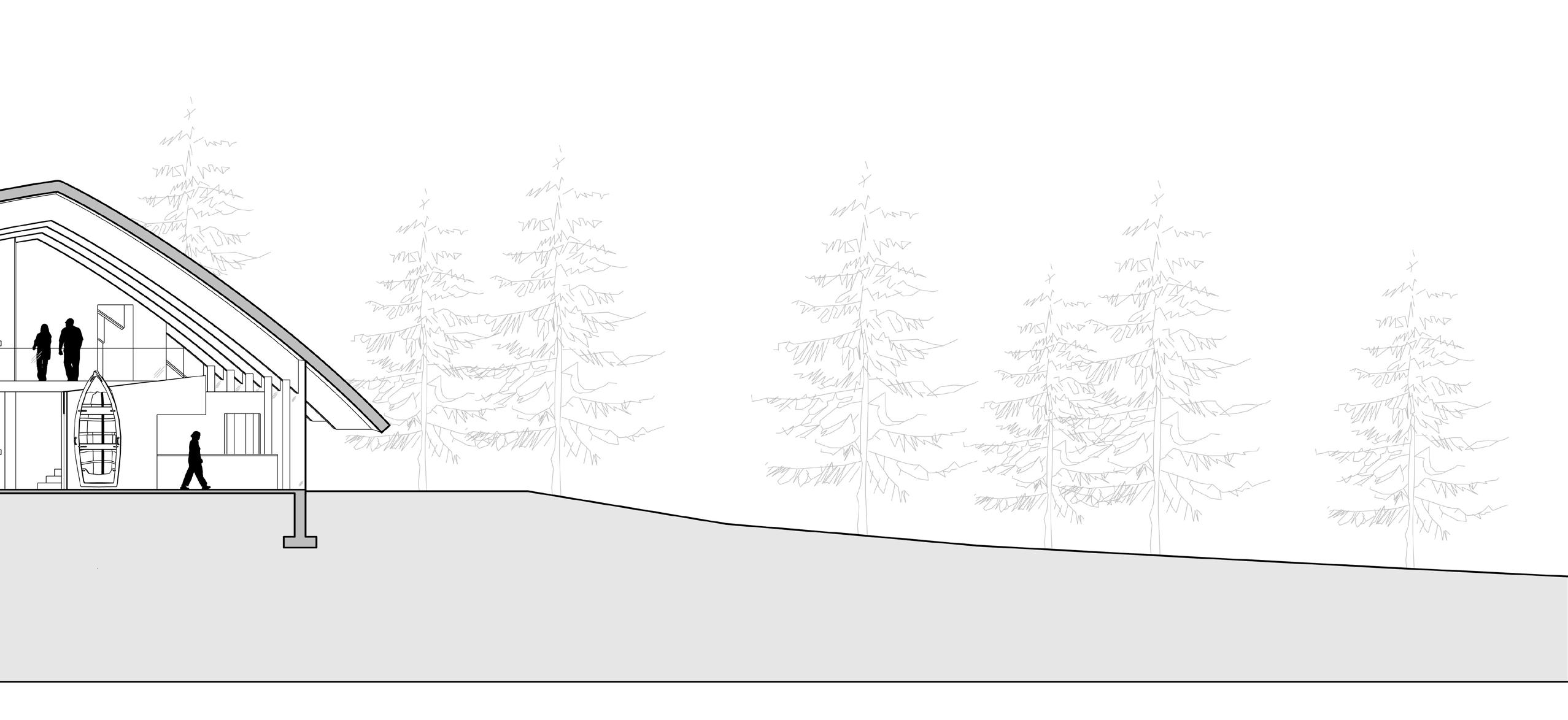 The objective of this project is to design a new boat building facility using wood framing design. Engaging the students and the community through boat building is seen in this design with the creation of an amphitheater encasing the building and the boat shed lacking walls. The design for the amphitheater came from original dugout canoes Native Americans would build out of solid tree trunks. The concept of the building was based off of a birch bark canoe, the Native Americans’ next progression in canoe design. The idea of the space is to create a grounded connection between students learning wooden boat building techniques and the history of wood boats being built in the walls around them. On the site, the building is placed to engage circulation from the current road to the water by opening up between the buildings and the amphitheater.