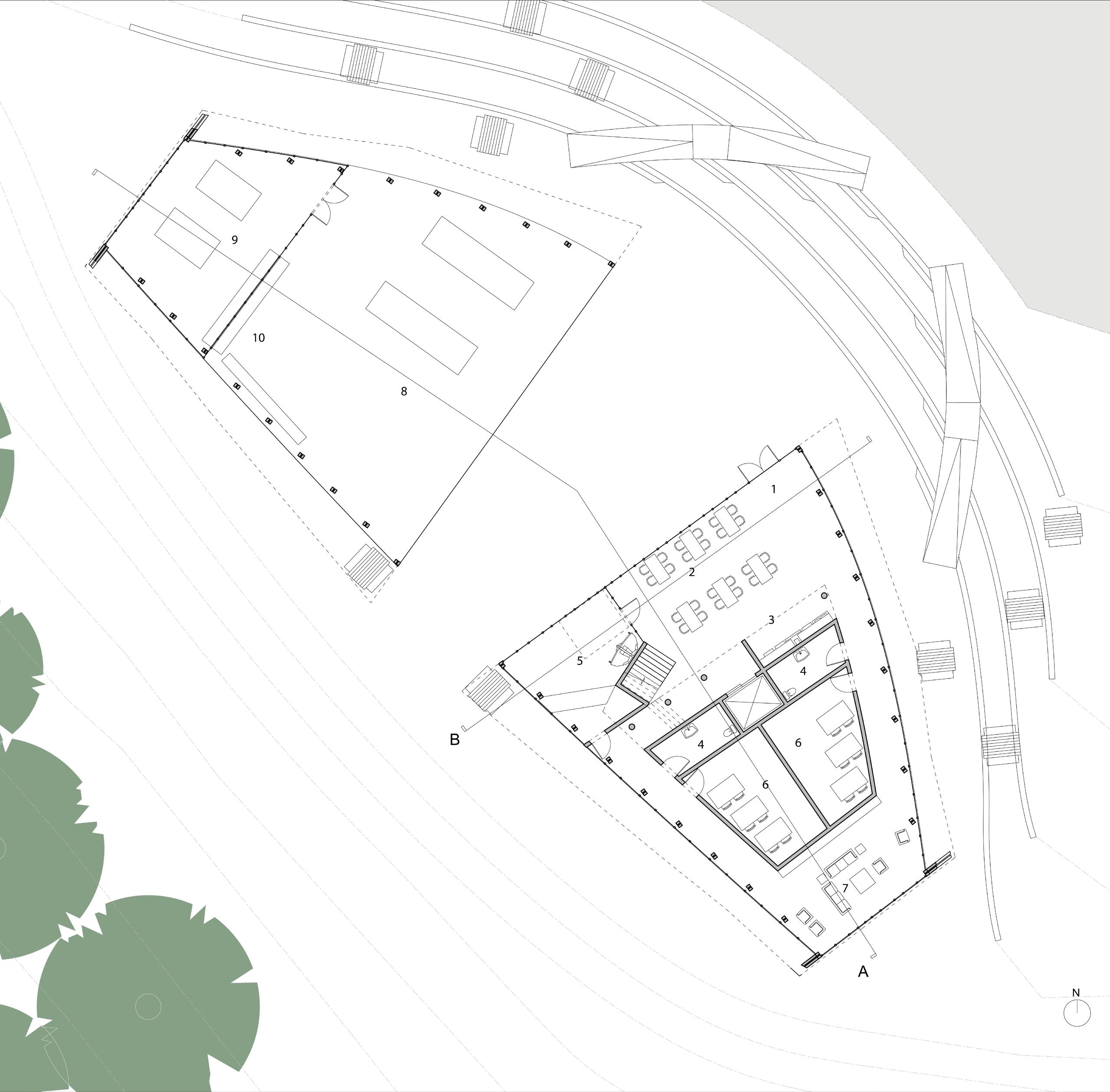 KEY 1.Lobby 2. Dining Area 3. Kitchen 4. Bathroom 5. Gift Shop 6. Classroom 7. Library / Meeting Space 8. Bug Shed 9. Wood Shop 10. Wood Storage Ground Floor Plan