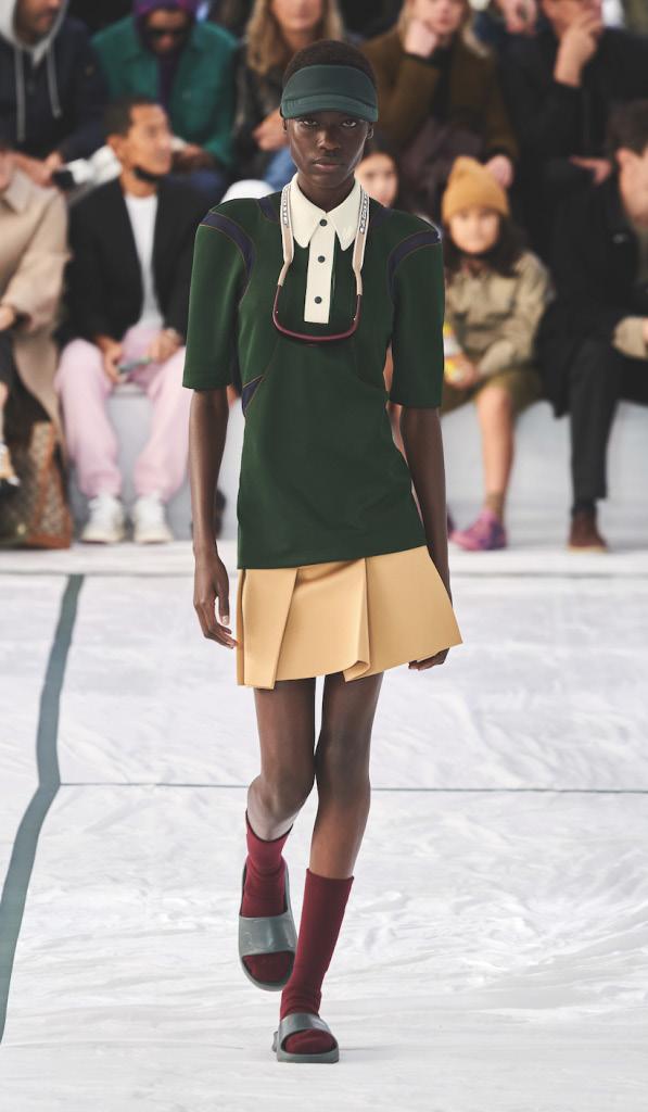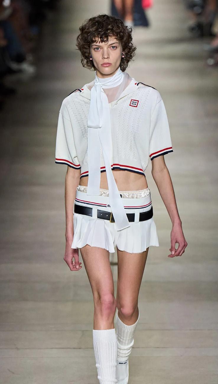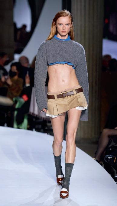 Tuy nhiên, không ai đóng đinh vẻ ngoài sách vở cho những năm 2020 rầm rộ như Miu Miu, hãng đã cập nhật áo len đan dây cáp, áo sơ mi Oxford và vải kaki với những đường cắt và bóng để lộ cả gam và bụng. Và trong khi các điểm nổi bật thông thường của diện mạo đều có mặt, không thể phủ nhận rằng mùa này thuộc về váy ngắn, thứ luôn gắn liền với phong cách Preppy. Chiếc micro mini của Miu Miu đã lan truyền theo đúng nghĩa đen, được mệnh danh là “không mặc váy mà nhiều thắt lưng” và xuất hiện trên các trang của Interview, chứng tỏ việc mặc váy ngắn không còn giới hạn độ tuổi. Dòng A-line mini tại Courrèges bắt nguồn từ những năm 60 của Swinging, Bottega Veneta tạo nên gu thời trang cao cấp trên một chiếc mini xếp nếp thể thao và chiếc váy ngắn bằng satin bóng bẩy của Prada được tặng thêm một chiếc xe lửa để tăng thêm phần kịch tính.