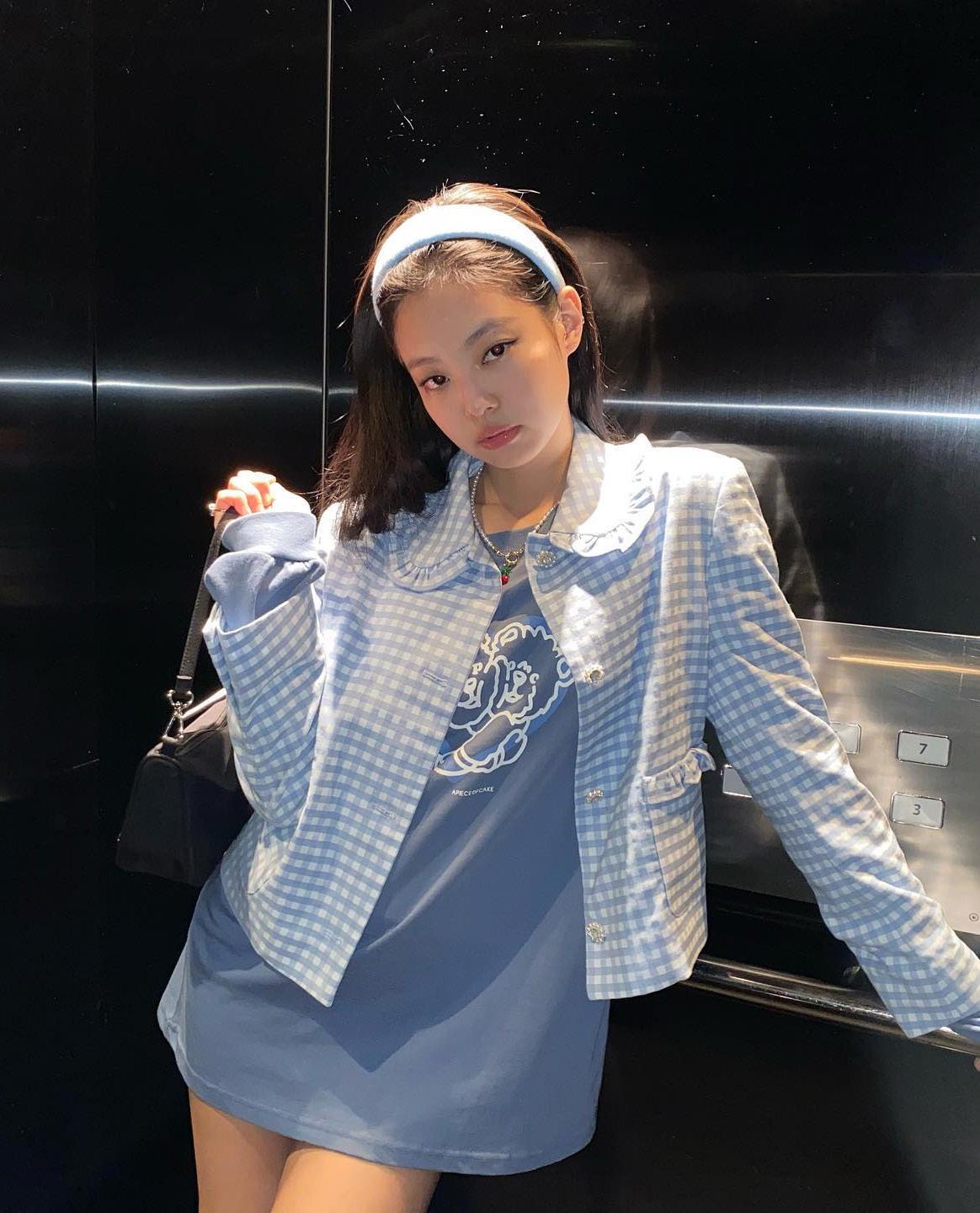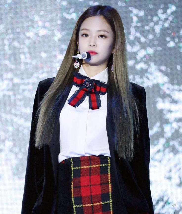 Jennie từng gây sốt khi xuất hiện cùng bộ trang đậm chất Preppy. Nữ idol đã xây dựng được hình ảnh nàng tiểu thư nhà giàu sang chảnh cực kỳ thành công. Diện blazer nhung, sơ mi trắng sơ vin cùng chân váy họa tiết tartan và nơ cổ đã tạo nên những khoảnh khắc ấn tượng.