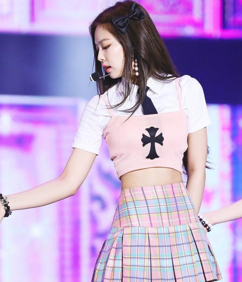 Jennie luôn chứng minh rằng bản thân có gu thẩm mỹ cao qua bộ cánh màu hồng nữ tính. Cô nàng kết hợp áo crop top cùng váy ngắn kẻ sọc tạo cho vẻ ngoài nét đẹp tươi mới. Để tăng thêm vẻ thời thường, nữ idol còn phối thêm vòng tay ngọc trai, nơ cài tóc và cà vạt mini.