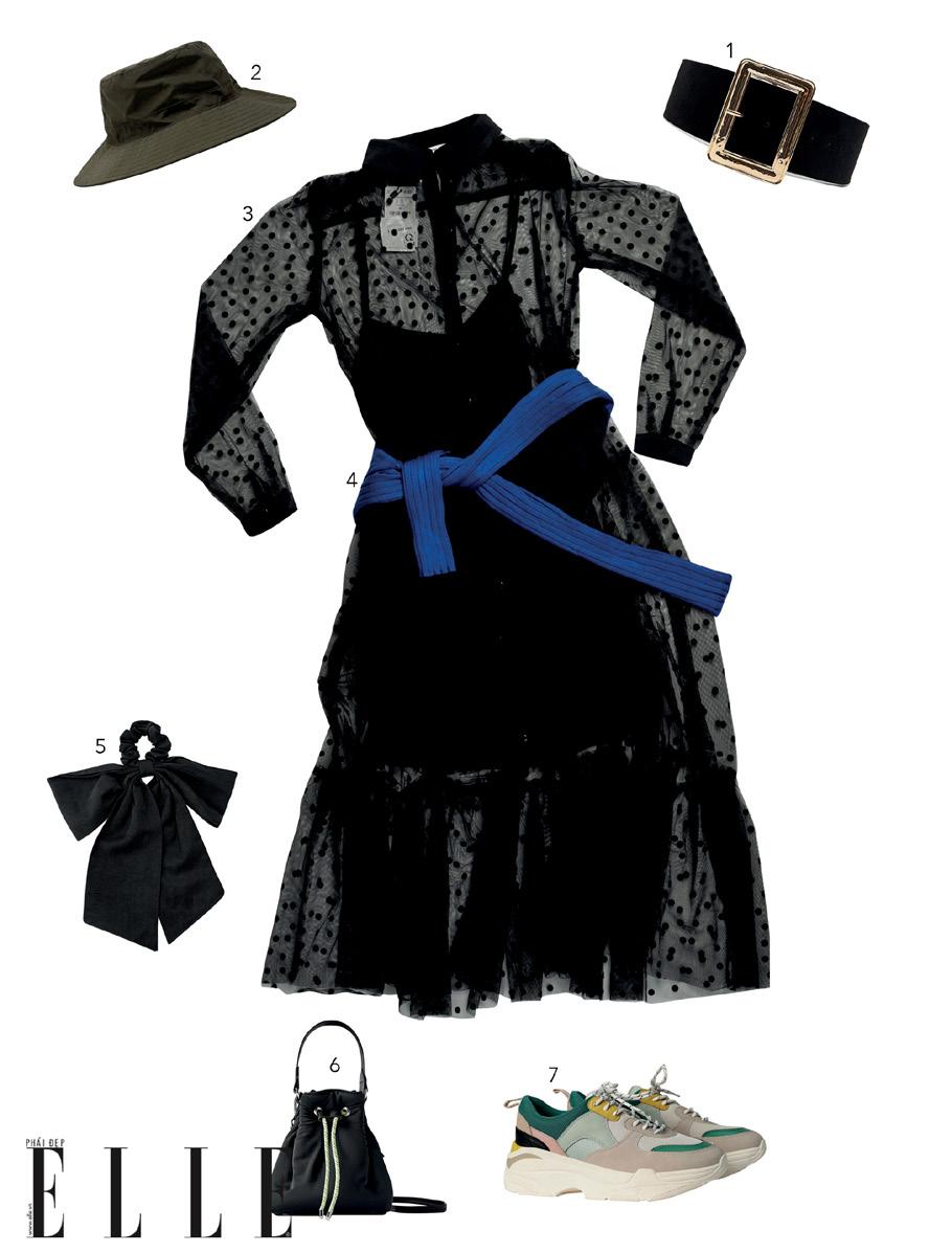 Đầm ren đen chấm bi cho dáng vẻ kín đáo, nữ tính, nhưng khi phối cùng giày sneakers lại tăng thêm vẻ tinh nghịch sáng tạo. Một chiếc mũ màu sáng sẽ là điểm nhấn đáng yêu cho cả bộ trang phục.