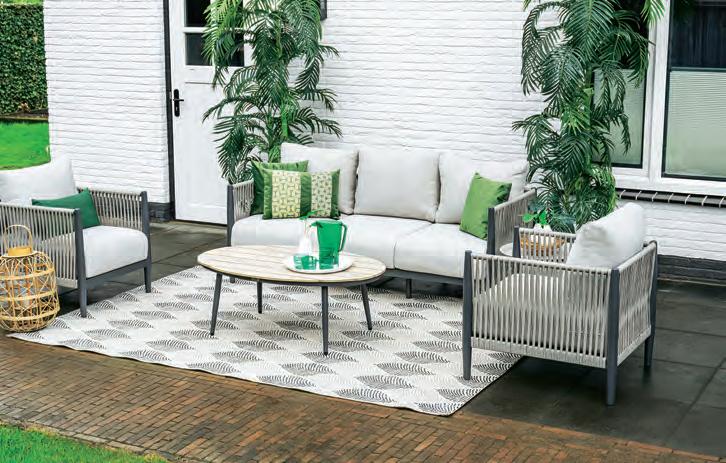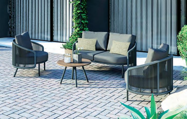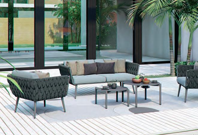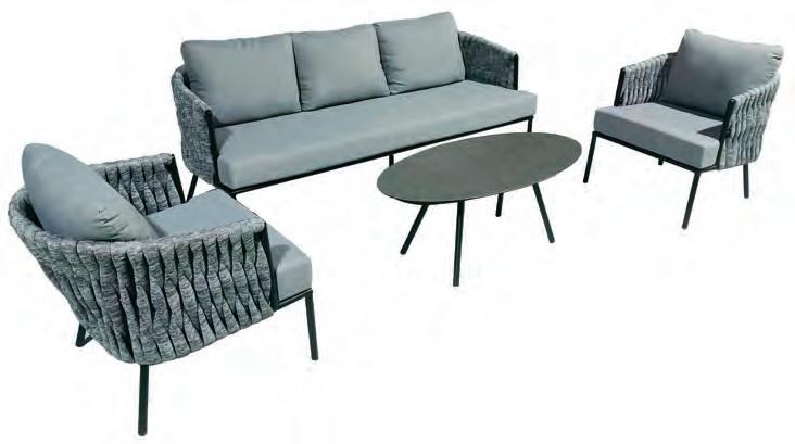 E Salon de jardin Clermont, 3 éléments. Allure moderne, en larges cordes grises, aspect tricoté. Piètements en aluminium thermolaqué, anthracite. Enveloppes zippées en Oléfine polyester. Dim. (LoxLaxH): env. canapé, 145x75x68 cm, 2 fauteuils, 85x75x68 cm. Tables basses non comprises. Livraison sans coussins décoratifs. T58 790 03 14 90.– 998.–