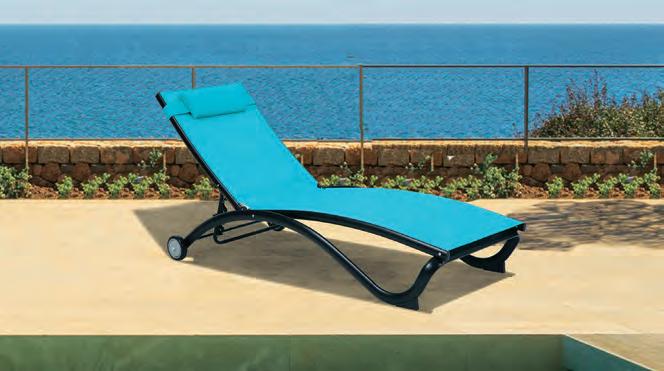 A Chaise longue Soleil sur 2 roulettes. Piètement en alu, revêtement textile. Avec coussin appui-tête. Dossier réglable sur 4 niveaux. Dim. (LoxLaxH): 192x62/54x97/29,5 cm.