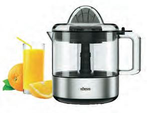 R Koenig Basic Line Zitruspresse 800 ml. Siebeinsatz: Einstellbarer Fruchtfleischanteil. 2 auswechselbare Presskegel. BPA freier Füllkrug mit Griff und Messskala. Kunststoffgehäuse/Edelstahl. Kabellänge: ca. 1 m. 30 W. LxTxH