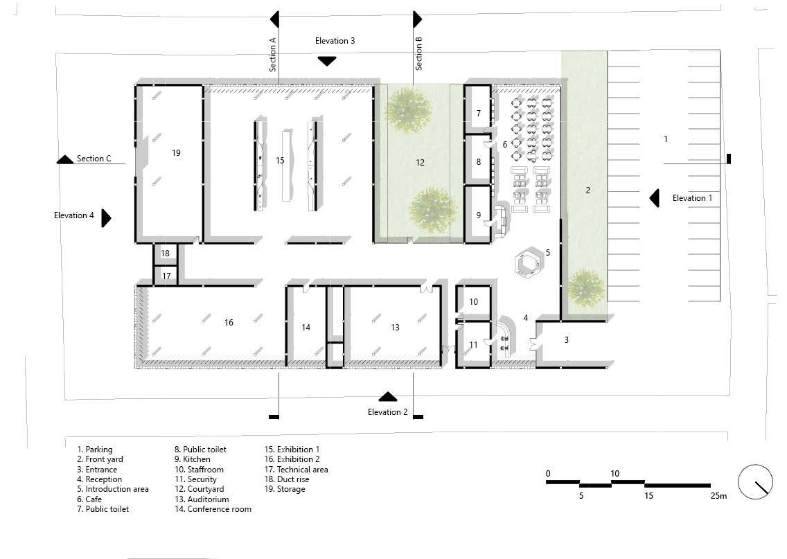 The cultural exhibition in the middle of the building is designed to connect to demonstrate the journey of coffee culture from Europe to Asia. The courtyard in between the cultural spaces operates as an area for planting coffee bushes to spread the aroma of the coffee bean. Furthermore, the cafe at the end combines with the harbour, which is utilized for coffee transportation by the river.