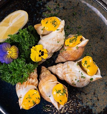Normandy bulot, garlic, butter, parsley leaves, lemon