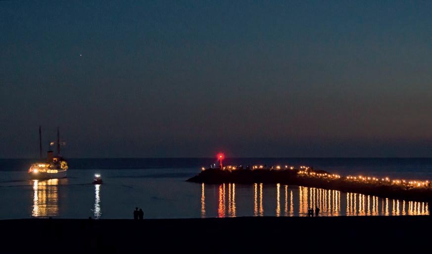 Foto: Johannes Tarp Kongeskibet forlader havnen i Hvide Sande. En stor fakkelopstilling viser vej. Sept. 2014