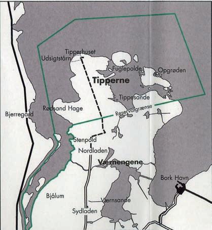 Den grønne streg markerer grænsen omkring fuglereservatet Tipperne, som består af 700 hektar landareal og 1500 hektar søterritorium. Området har tilhørt staten siden 1770’erne, og skellet til Værnengene blev placeret ved at trække en streg fra Lønborg Kirke til det dengang sydligst liggende hus på Holmsland Klit. Den første fredning af fuglelivet på Tipperne gennemførtes allerede i 1898. Området blev yderligere fredet i 1928, og der ansattes en opsynsmand. I 1936 fik det betegnelsen »naturvidenskabeligt reservat«.
