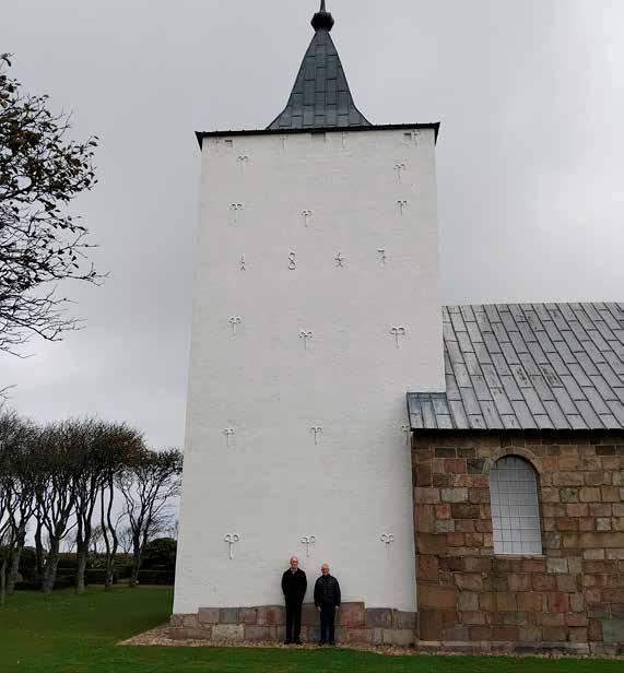 var i gang, så blev Gammelsogn Kirke i 2023 kåret som landets smukkeste. Her står de to erfarne venner (Hans til venstre, Peter til højre) af huset ved det synlige