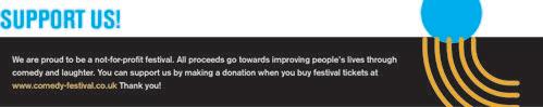 Leicester Comedy Festival 2023 24 Don’t forget that everything in our brochure is listed alphabetically rather than in date order. The performance dates for each show are shown under each entry in black. We’ve also included an A-Z list of all the performers in the festival, with page references so you can easily find them, and a festival diary, so you can see who is performing on each day. OUR LISTINGS EXPLAINED RESERVED SEATING Your ticket will give you access to a pre-allocated, numbered seat. NON RESERVED SEATING Your ticket will give you access to seating allocated on a first, come first served basis. Arrive early for the best seats in the house. SIGNED SHOW This indicates a British Sign Language interpreted performance. A series of seminars aimed at people who want to delve a little deeper into issues linked to contemporary society and comedy. See page 23 for the full list of shows. The Fridge is a loose collective of comedians based locally. Appearance dates in black with keyline, with Weekends underlined Reserved / non reserved seating Differing times on different dates Refers to map on pages 158-162 Price Beyond a joke Start time Approximate finish time LCF Fridge Signed Show LCF FRIDGE BEYOND A JOKE INFORMATION WANT TICKETS? visit www.comedy-festival.co.uk or call 0116 456 6812