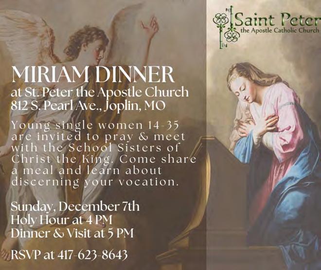 It’s always nice to begin my column with “THANK YOU!” This time, thank you for your participation in the National Religious Retirement Collection that supports the religious priests, sisters, and brothers who served so faithfully in our Catholic institutions throughout the United States. The Diocese of SpringfieldCape Girardeau donated $91,552.66 in the year 2024. The funds collected assists 266 religious communities across the United States with nursing care, medication, therapy, long-term care, and retirement planning. Many of us have fond memories of the priests, sisters, and brothers who educated or cared for us along the way of life. Now is our chance to care for them. THANK YOU!