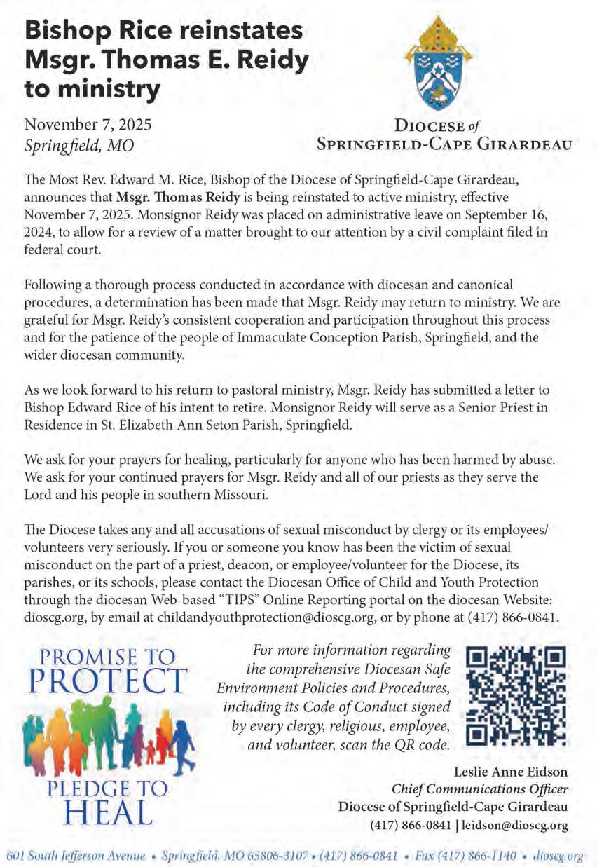 For more information, please contact the Office of Child and Youth Protection, childandyouthprotection@dioscg.org; or Bill Holtmeyer, billholtmeyer@dioscg.org; or Shelly Ferry, sferry@dioscg.org, (417) 866-0841.