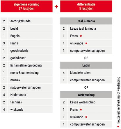 Daarnaast kiezen de leerlingen in de keuzegedeeltes taal & media en wetenschap voor 1 lestijd versterking of verdieping Frans en 1 lestijd versterking of verdieping wiskunde. In het uur versterking worden de leerlingen versterkt met herhalingsoefeningen en -opdrachten. De leerlingen krijgen extra uitleg bij de leerstof. In het uur verdieping wordt de leerstof verdiept met uitdagende oefeningen en opdrachten.