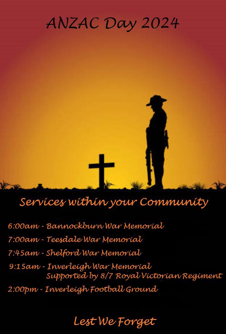 Later in the afternoon at 1400hrs (2pm), there is a football match with ANZAC Celebrations at Inverleigh Sporting Complex.
