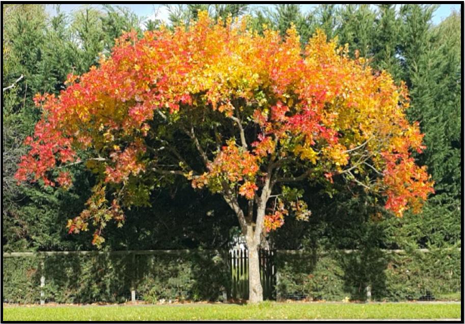 SusanneThe tree featured for March in the Inverleigh Historical Society 2024 calendar is a Chinese Pistachio (Pistacia chinensis). It grows on the south side of High Street, west of the row of shops beside the CFA. It is stunning in autumn against the dark green back drop of the hedge.