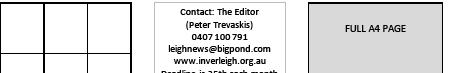 For further information about advertising and costs in the Leigh News: contact Peter Trevaskis on 0407 100 791 or leighnews@bigpond.com Please forward accounts and payments to: Tony Waayers, Leigh News, inverleighpa@yahoo.com.au PO Box 247, Inverleigh 3321. Phone: 0418 489 486 Committee Members: Hilary Hamilton (President) 0418 348 110. Tony Waayers (Treasurer) 0418 489 486. Peter Trevaskis (Editor) 0407 100 791.