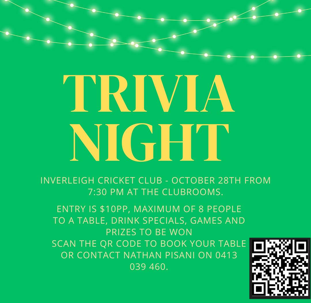 We have also locked in our first function for the season with a Trivia Night being held on Saturday October 28th 7:30 – late at the clubrooms. Entry is $10 per person, with a maximum of 8 people on a table. You can book your table now by contacting Nathan Pisani on 0413 039 460 or scanning the QR code on the attached poster.