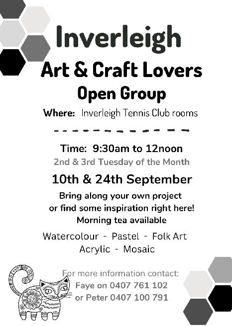 Meet in the Inverleigh Public Hall @ Midday on 2nd Thursday each Month for cooked Lunch ($10), guest speaker and afternoon tea and 4th Thursday each month for an outing or other special activity.