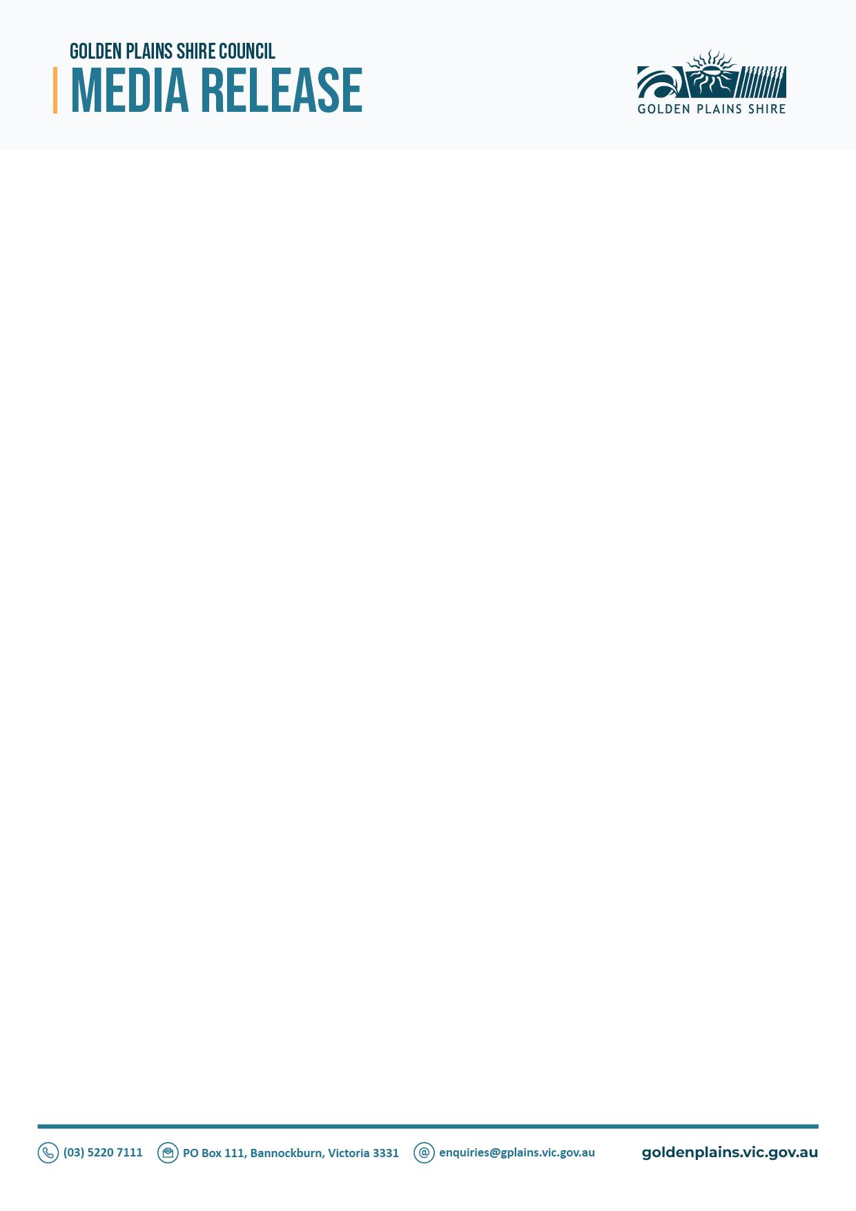 Media contact: Georgia Stefanovski, Advisor, Communications & Engagement, Golden Plains Shire Council P. 5220 7187 │ M. 0402 381 801 │E. georgia.stefanovski@gplains.vic.gov.au