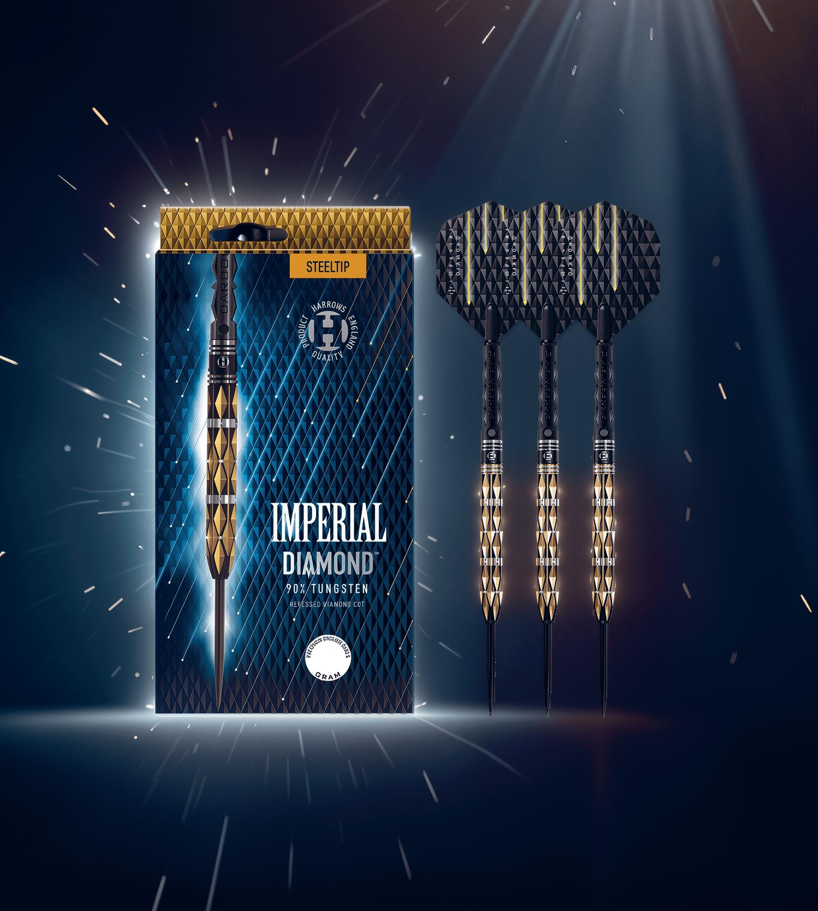 Experience precision and performance with the Imperial Diamond 90% Steel Tip Darts. Crafted from the finest injection-moulded 90% tungsten, these darts are a testament to Harrows’ exceptional machining capabilities. The recessed diamond cuts along the barrel provide a unique grip and aesthetic appeal, while the tough black titanium nitride and gold coatings ensure durability and style.
