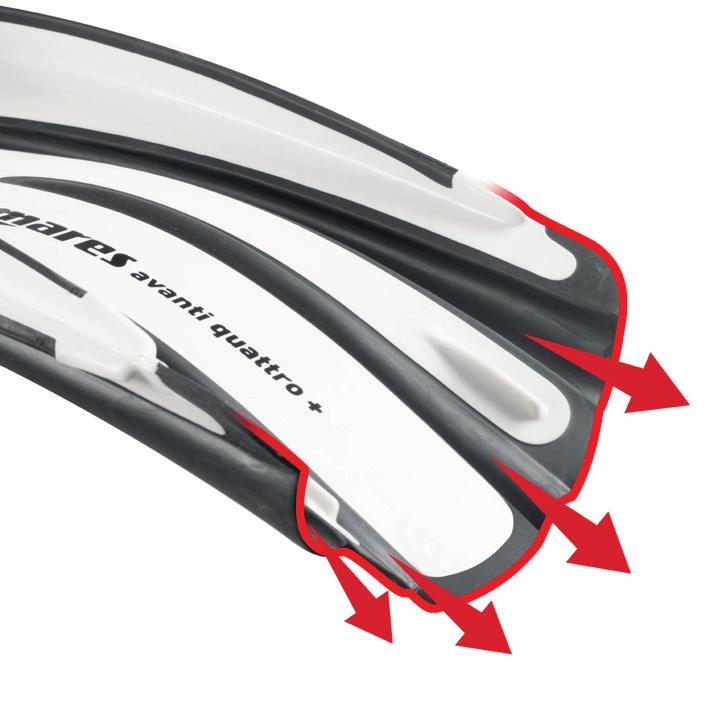 블레이드 중앙에는 크고 유연한 재질 의 슈퍼채널로 설계되어, 물이 측면으 로 빠져나가는 대신 물 흐름을 중앙으 로 유도하여 보다 효율적으로 추진합 니다. 최소한의 노력으로 최대의 성능 을 추구하는 다이버를 위한 기술입니 다.