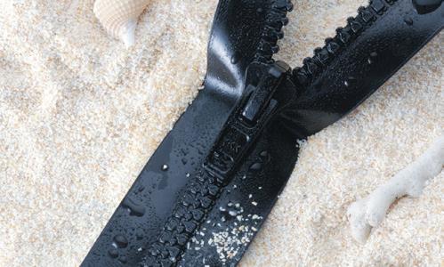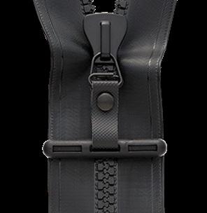 YKK 아쿠아씰 비슬론 타입의 방수 지퍼.플라스틱으로 일 반 금속제 방수지퍼보다 가볍고 유연하여, 편하게 개폐할 수 있습니다.YKK사와의 공 동 개발에 의해서, 종래보다 기밀성이 높은 구조로 개량했습니다.