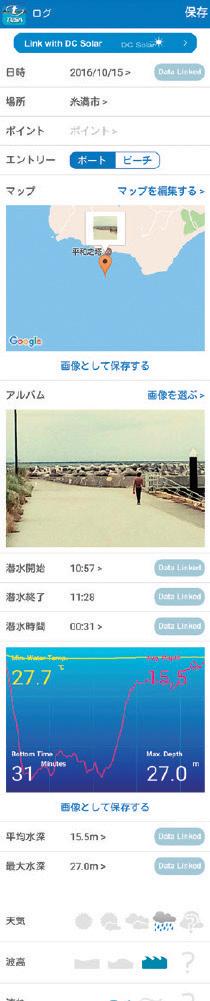 • DC SOLAR LINK 와 함께 시간 당 수심을 그래프 표시 •다이빙 포인트의 위치 정보를 지도에 기록 표시