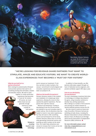 In addition to these benefits, we offer partners after-sales support through our team of dedicated service engineers, who provide worldwide support 365 days a year. How are you developing the new business? The key to developing a business that relies on technology is to always stay ahead of the game, using innovative solutions to develop new, exciting experiences. We’re talking to a number of UK museums and carrying out market research to identify potential partners across the UK. We also intend to build our brand and raise the profile of Simworx Ventures by exhibiting at trade shows, including the Museum Association’s annual conference, Museum Next, the Museums & Heritage Show and the Association of Independent Museums (AIM) conference. ● For more information please contact Andy Gray, andygray@simworx.co.uk www.simworx.co.uk attractionsmanagement.com