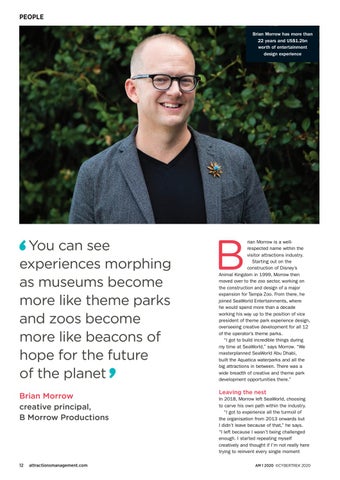 rian Morrow is a wellrespected name within the visitor attractions industry. Starting out on the construction of Disney’s Animal Kingdom in 1999, Morrow then moved over to the zoo sector, working on the construction and design of a major expansion for Tampa Zoo. From there, he joined SeaWorld Entertainments, where he would spend more than a decade working his way up to the position of vice president of theme park experience design, overseeing creative development for all 12 of the operator’s theme parks. “I got to build incredible things during my time at SeaWorld,” says Morrow. “We masterplanned SeaWorld Abu Dhabi, built the Aquatica waterparks and all the big attractions in between. There was a wide breadth of creative and theme park development opportunities there.”