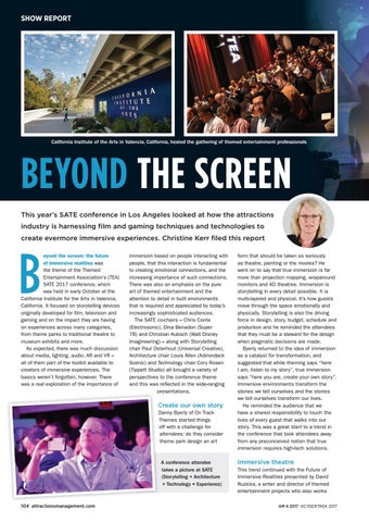 BEYOND THE SCREEN This year’s SATE conference in Los Angeles looked at how the attractions industry is harnessing film and gaming techniques and technologies to create evermore immersive experiences. Christine Kerr filed this report