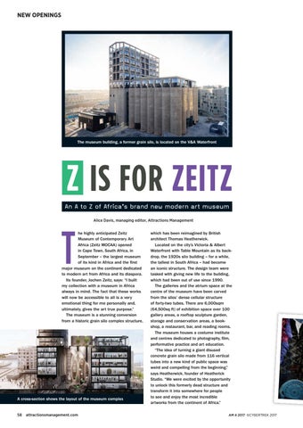 which has been reimagined by British architect Thomas Heatherwick. Located on the city’s Victoria & Albert Waterfront with Table Mountain as its backdrop, the 1920s silo building – for a while, the tallest in South Africa – had become an iconic structure. The design team were tasked with giving new life to the building, which had been out of use since 1990. The galleries and the atrium space at the centre of the museum have been carved from the silos’ dense cellular structure of forty-two tubes. There are 6,000sqm (64,500sq ft) of exhibition space over 100 gallery areas, a rooftop sculpture garden, storage and conservation areas, a bookshop, a restaurant, bar, and reading rooms. The museum houses a costume institute and centres dedicated to photography, film, performative practice and art education. “The idea of turning a giant disused concrete grain silo made from 116 vertical tubes into a new kind of public space was weird and compelling from the beginning,” says Heatherwick, founder of Heatherick Studio. “We were excited by the opportunity to unlock this formerly dead structure and transform it into somewhere for people to see and enjoy the most incredible artworks from the continent of Africa.” AM 4 2017 ©CYBERTREK 2017