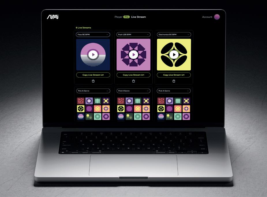 Aimi Player Pro offers advanced controls for clubs seeking greater fl exibility, with features such as offline playback, access to diverse musical genres and unique soundscapes for personalised listening that fi ts their brand.