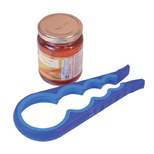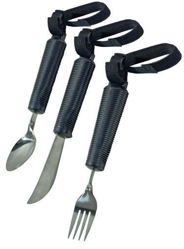 Set za pomoč pri hranjenju vključuje upogljivi žlico in vilico ter nož, ki z nihanjem enostavno reže hrano. Priloženi so trije trakovi za boljši oprijem in stabilnost. Opere se lahko tudi v pomivalnem stroju. Primeren za uporabnike z oslabljenim oprijemom ali omejeno spretnostjo rok.