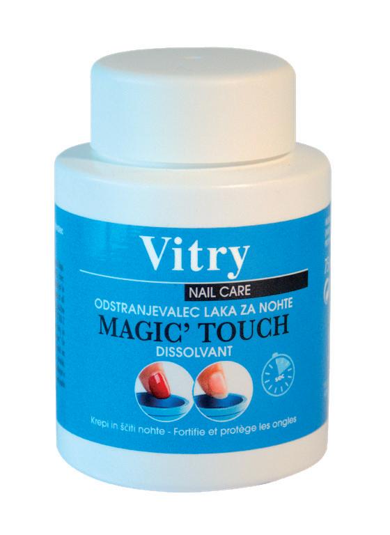 Odstranjevalec laka za nohte Magic touch, 75 ml Zelo enostavno in hitro odstranjevanje laka za nohte. Brez vate – nohte le potopite v prepojeno peno, zavrtite prst in lak je odstranjen. Ker izdelek ne vsebuje acetona, ne izsuši kože na prstih. Krepi in ščiti nohte.
