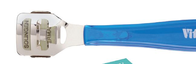 Nežno odstrani odmrlo kožo in otiščance. Ergonomska oblika ročaja olajša uporabo strgala. Strgalo ima dve vrsti peska: groba zrna - hrapavi del za odstranjevanje otiščancev in drobna zrnazaobljeni del za poliranje kože in masažo podplata.