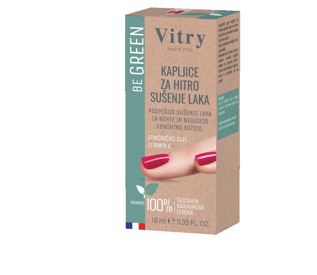 Kapljice za hitro sušenje laka Vitry Be Green, 10 ml Namažite lak na nohte in nato s kapalko nanesite kapljico izdelka na obnohtno kožico. Pustite, da se kapljica razlije po nohtu in počakajte, da se posuši.