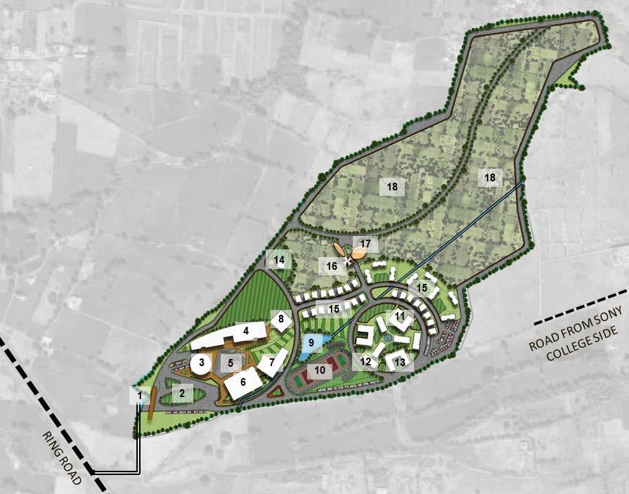 1 - MAIN ENTRANCE GATE. 2 - ENTRANCEPLAZA 3 - AMINISTRATIVEBLOCK 4 - DEPARTMENT / FACULTY BUILDING 5 - AMPHI THEATRE 6 - RECREATIONAL BLOCK 7 - AUDITORIUM 8 - LIBRARY 9 - CENTRAL WATER FEATURE 10 - RUNNING TRACK & COURTS 11 - HOSTEL BLOCKS 12 - INTERNATIONAL HOSTEL 13 - GUEST HOUSE 14 - DEAN BUNGALOW 15 - STAFF HOUSING 16 - ICONIC STUCTURE 17 - FARM / ORCHARD OFFICE 18 - FARMING LAND SITE PLANS VEHICULAR PEDESTRIANCONNECTIVITYCONNECTIVITYVEHICLEPARKING CONCEPTUAL PLANNING with PHASE DIVISION and CONCEPTUAL SKETCH for ORCHID OFFICE & STORAGE 42 43