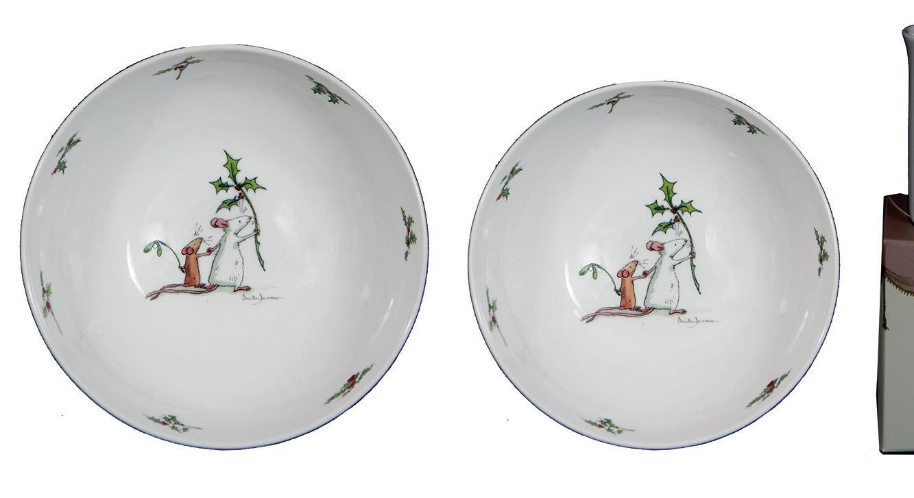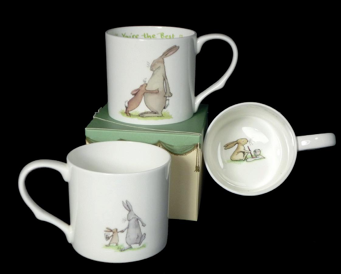 Ceramics were added to the range in 2007. Mostly mugs and bowls, the transfers and finishing is all done in Stoke on ‘whites’ of the company’s own shapes. The mugs are packed in colourful boxes and the illustrations, which tell stories, extend all over each mug. Cute cats, dogs and rabbits feature across the collection, along with rabbits, swans and many more.