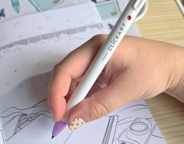 In fact, with the increasing awareness of how modern stresses and issues such as digital fatigue can a ect personal wellbeing and mental health, it’s no surprise that this pastime is now seen as an ideal way for people to unwind after a long day. In particular, the recent ‘cosy colouring’ trend can be a great way to maximise relaxation, whether that be within a communal environment or on a more individual basis. Compared with prolonged screen-time activities, its simplicity and warm, comforting themes can help reduce anxiety and improve sleep quality. With this in mind, Zebra Pen has been expanding its most successful ranges to include more colours then ever before. Perfect for basic colouring, as well as more intricate artwork, an extra 17 shades have been added to the selection of CLiCKART retractable felt tips. The water-based dye ink used in these felt tips allows light colours to be overlayed with dark shades without bleeding. They can also be blended with water, enabling the user to experiment further with watercolour-style imagery.