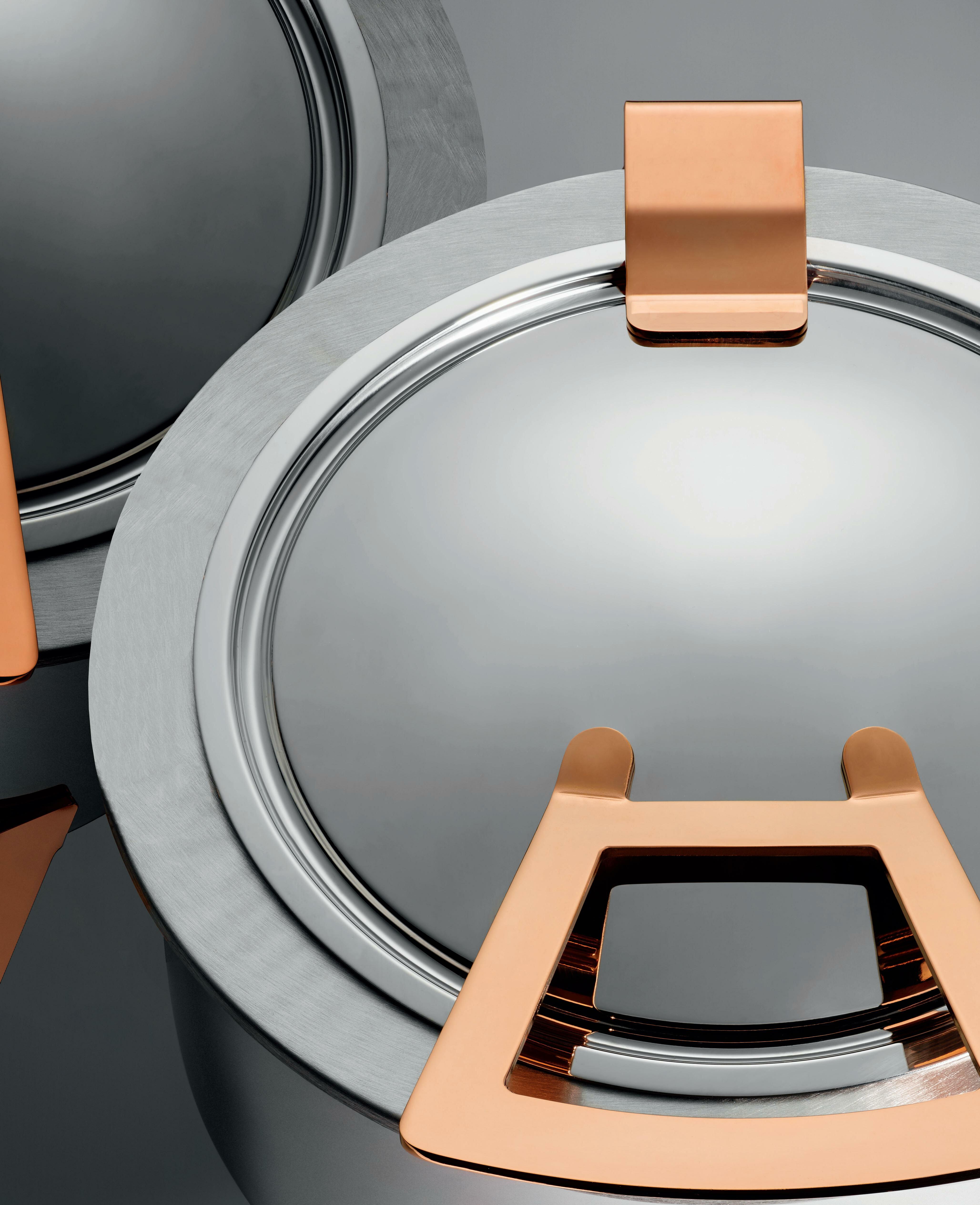 With Kyma, Sambonet has chosen next-generation finishes in copper, gold, and what they describe as “hi-tech shades” – basically, the result of research developed in the application of PVD to steel, as well as electropolishing and silvering techniques for steel. The result is otherworldly, hyper-pigmented pieces which are incredibly impactful.